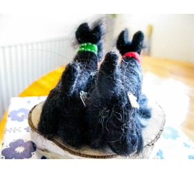 They are little jaunty fellows - made from black Merino, brown Zwartble undercoat and Alpaca wool for the top coat by needle felting. Usually small enough to hold in your hand and everyone a little different and hopefully very sweet.