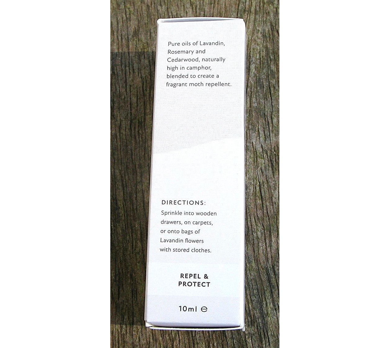 Add this powerful insect-repelling fragrance to your wardrobe. A 100% pure essential oil blend of cedar, Kentish Lavandin and Rosemary this Moth Oil, will repel moths while still smelling good. Sprinkle a few drops onto a Lavender sachet, and hang in your wardrobe.