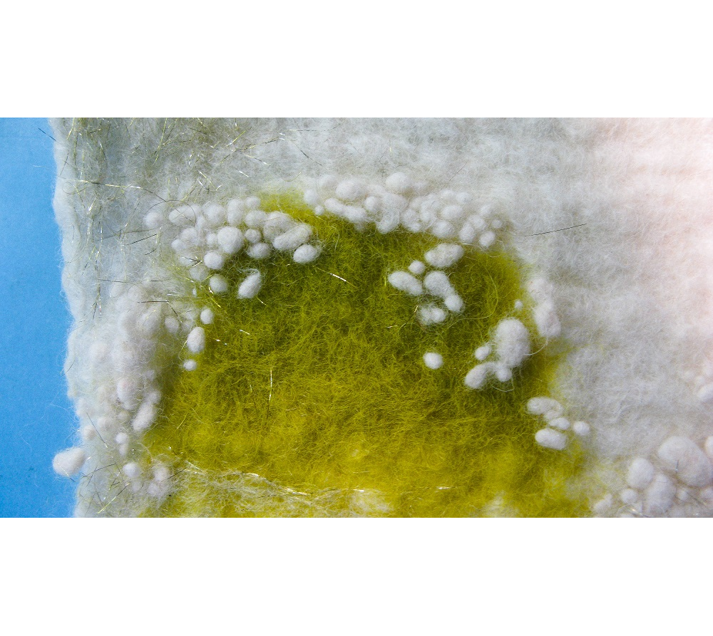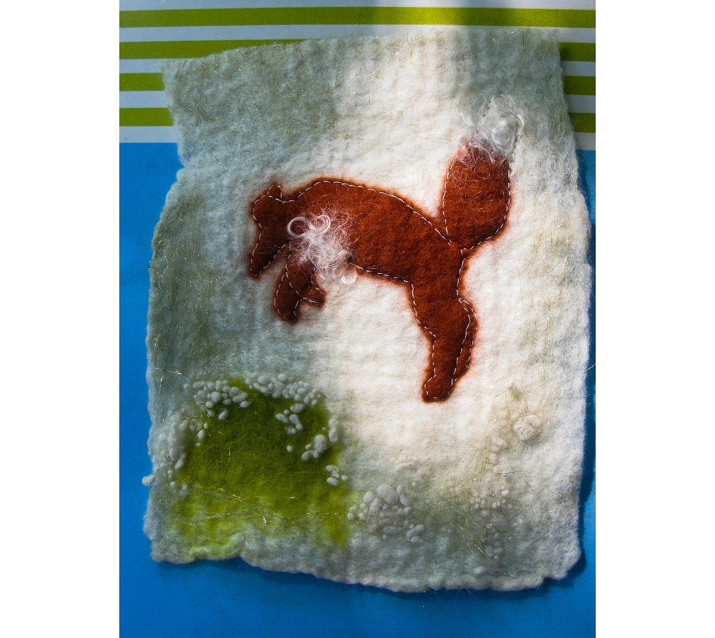 On layers of white merino wool, added silhouette of a pouncing fox from Felt previously made and green, white and gold sparkly wool details and some Felt bobbles to the final layer before Wet Felting. When the Felt was dry, hand embroidered details. Love the warmth and dimples of home made felt. This piece of Felt was made to learn and explore the technique.