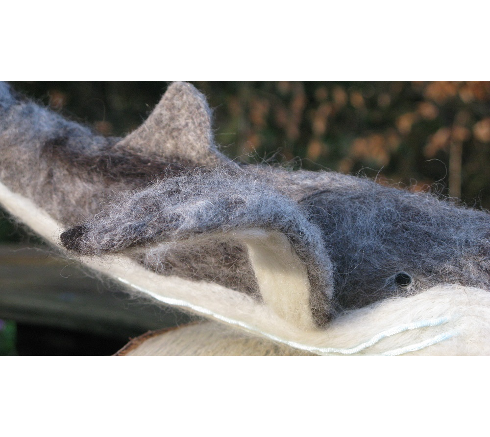 This is a grey and white woollen 3D Sculpture made by us - a Humpback Baleen Whale called Humphrey. We made this Whale to highlight the effect of pollution in the sea on marine animals.