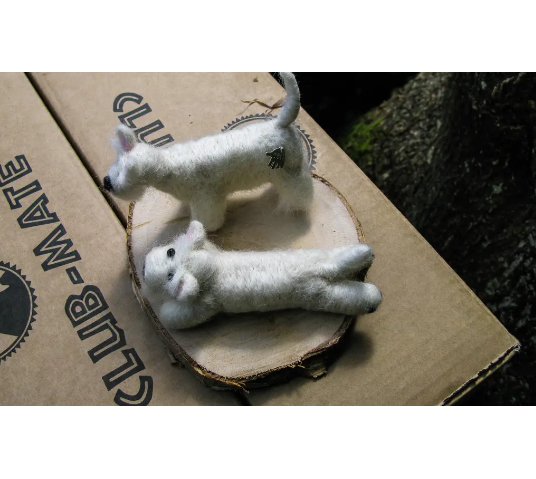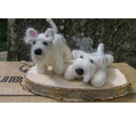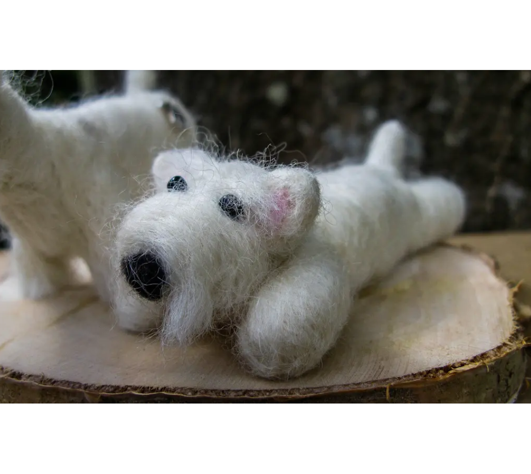 Our needle felted Westy dog pair are made to order. Jaunty little fellows made by needle felting - one sitting and one lying.