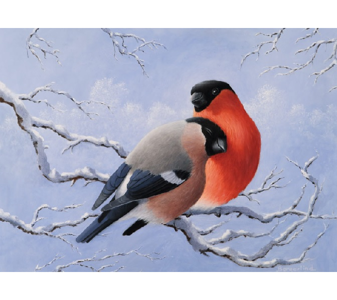 Jan Bergerlind's illustration of a pair of Bullfinches on a snowy branch