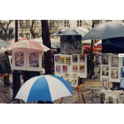 Paintings on a rainy day in the Place du Tertres, Monmartre - close to the Sacre Coeur and high up on its hill overlooking Paris. My son is in the photo too.