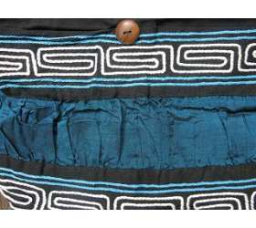 Our roomy shoulder bags made from cotton fabric and Thai silk, have a mixture of geometric embroidery and turqoise Thai silk and golden elephant panelling on the body of the bag. There is an interior pocket.